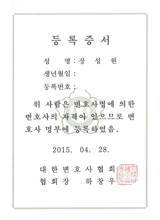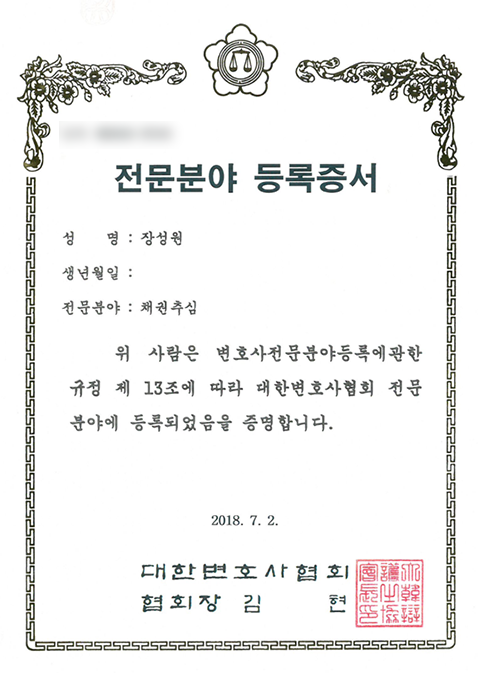 형사법 / 채권추심전문분야 등록 승소 시 채권추심까지 원스톱으로 가능한 곳 장성원 변호사 약력 서울 중동고등학교 졸업 한양대학교 법학과 졸업 현 고양시 도시분쟁조정위원회 위촉의원 현 고양시 정비사업 점검반 위촉의원 현 파주시 정비사업 점검반 위촉의원 현 경기지방노동위원회 권리구제 대리인 현 중앙노동위원회 권리구제 대리인 현 경기도교육청 공익제보 비실명 대리신고 전담변호사(안심호루라기 변호사) 현 기타 외부공표를 금지하는 국가기관들 위원 MBC 드라마 '역류' 자문변호사 TVN 드라마 '사이코메트리 그녀석' 자문변호사